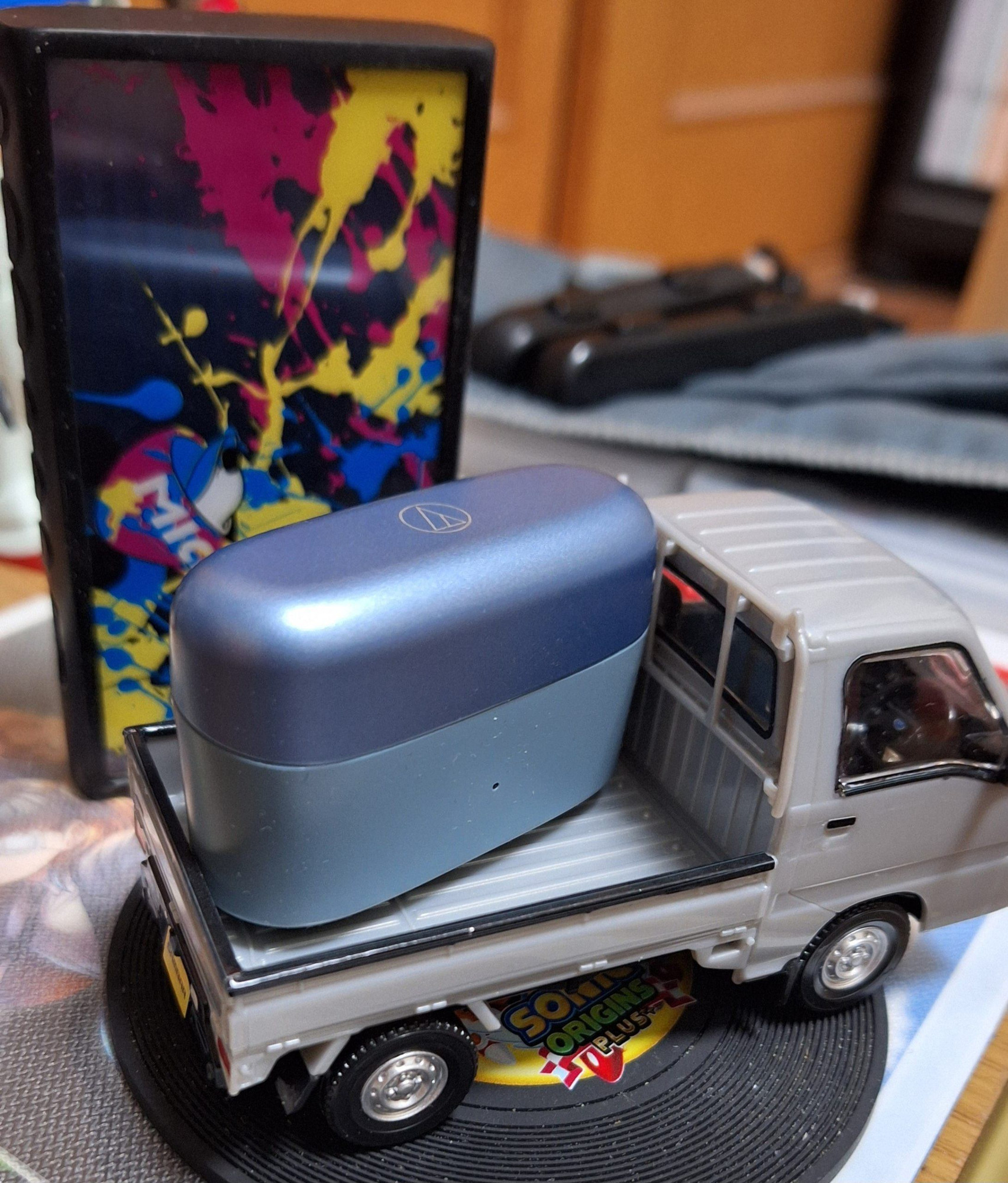 1枚目はテクニカのワイヤレスイヤホンを・・・コレは丁度いいサイズですね。